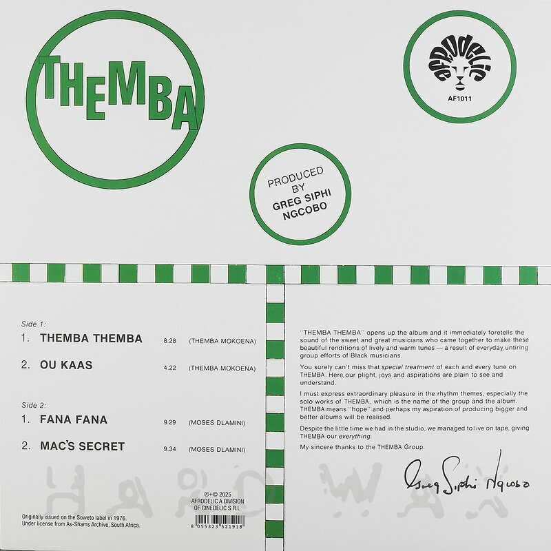 LP—LP € 28Afrodelic 011OuternationalThemba Mokoena: ThembaReissue of sought-after 70s South African groove / Jazz LP A1 Themba Themba A2 Ou Kaas B1 Fana Fana B2 Macs Secret