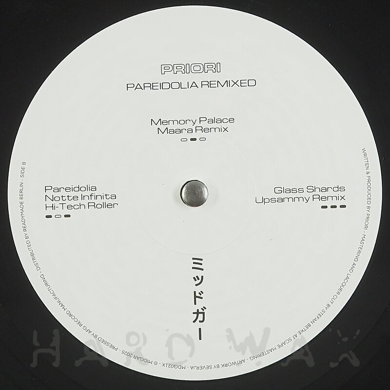 12"—12" € 18Midgar 021 XLabel CatalogPriori: Pareidolia REMIXEDDeeply tripped out, halftime to bouncy Drum & Bass / Techno remix pack A1 Hazard (FDW 85 Remix) A2 Hazard (FDW Slowmo Remix) B1 Memory Palace (Maara remix) B2 Pareidolia (Notte Infinita Hi-Tech Roller) B3 Glass Shards (Upsammy remix)