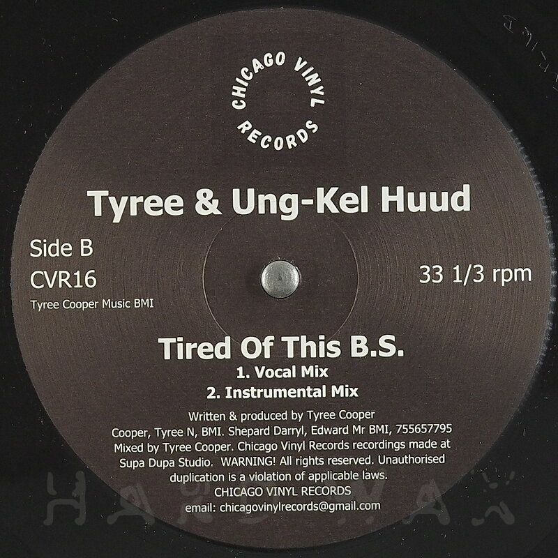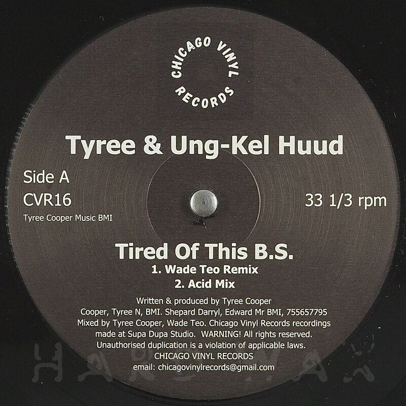 12"—12" € 18Chicago Vinyl 016Label CatalogTyree & Ung-Kel Huud: Tired Of This B.S.Chicago Hip House 2020 A1 Tired Of This B.S. (Eade Teo Remix) A2 Tired Of This B.S. (Acid Mix) B1 Tired Of This B.S. (Vocal Mix) B2 Tired Of This B.S. (Instrumental Mix)