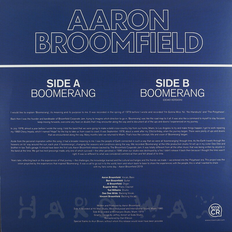 12"—12" € 16Crown Ruler 002DiscoAaron Broomfield: BoomerangOff-kilter, deadly, unearthed 80s Disco / Boogie heat A1 Boomerang B1 Boomerang (Demo Version)