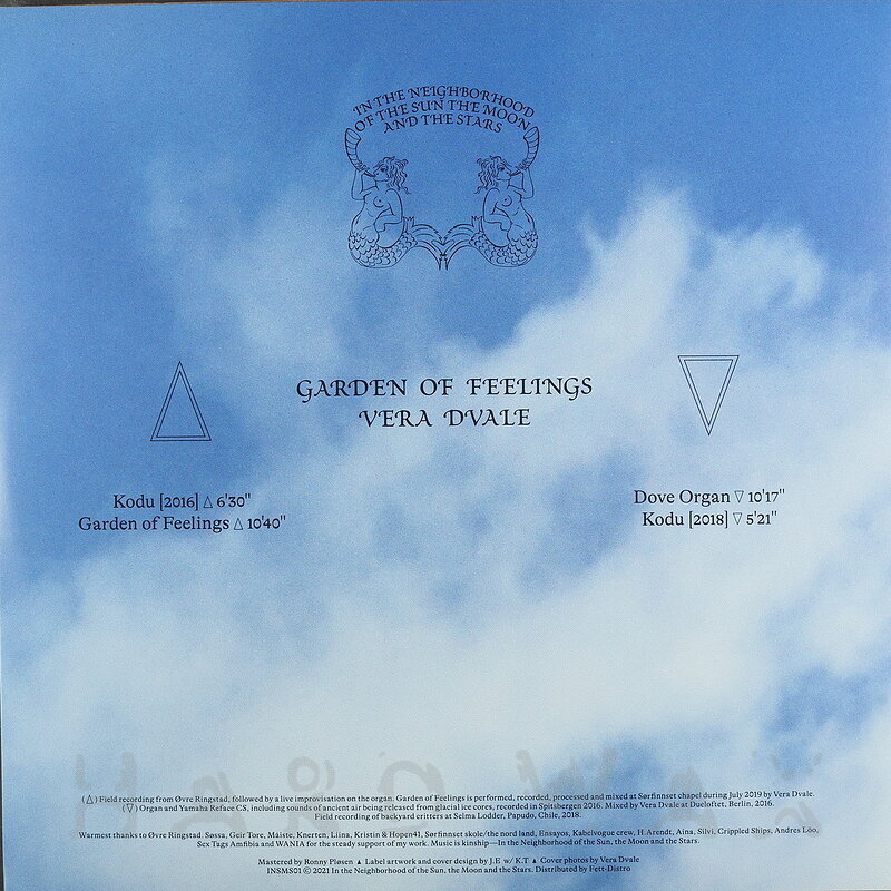 12"—12" € 16In The Neighborhood Of The Sun, Moon & Stars 001Label CatalogVera Dvale: Garden Of FeelingsBeautiful, touching, field recordings wrapped Drone / Ambient pieces A1 Kodu (2016) A2 Garden Of Feelings B1 Dove Organ B2 Kodu (2018)