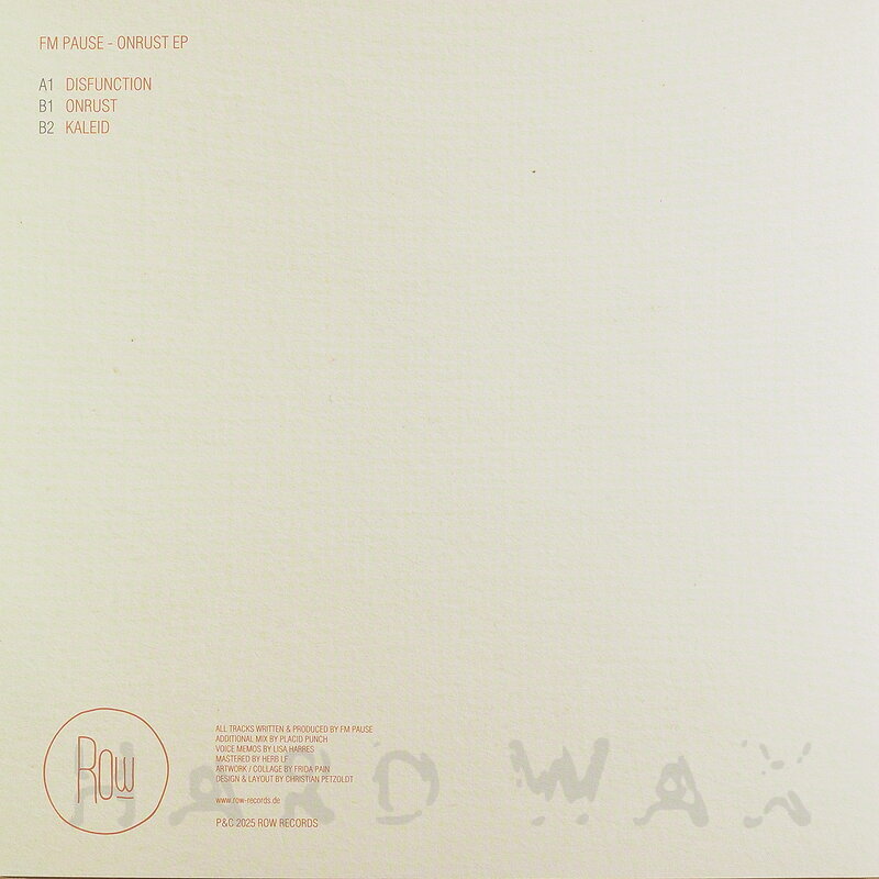 10"—10" € 17.5Row 018Label CatalogFM Pause: Onrust EPSparse UK Bass / Dubstep explorations A1 Disfunction B1 Onrust B2 Kaleid