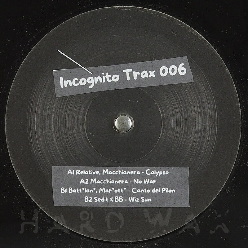 12"—12" € 20Incognito Trax 006Label CatalogVarious Artists: Incognito Trax 006Partly Disco rooted House DJ tool mini-compilation A1 Relative, Macchianera: Calypso A2 Macchianera: No War B1 Battlan& Marotti: Canto del Pilon B2 Sedit & BB: Wiz Sun