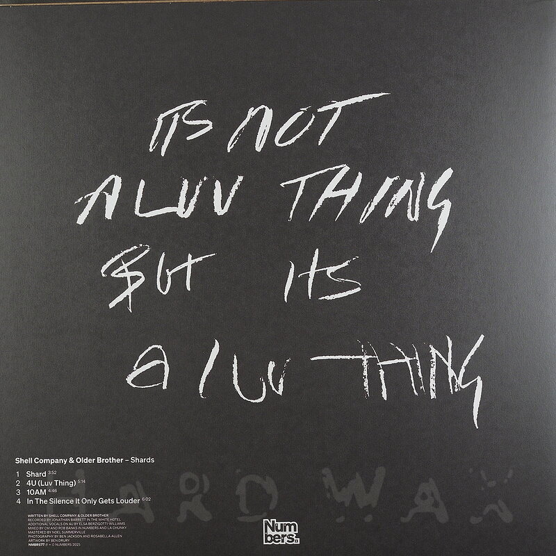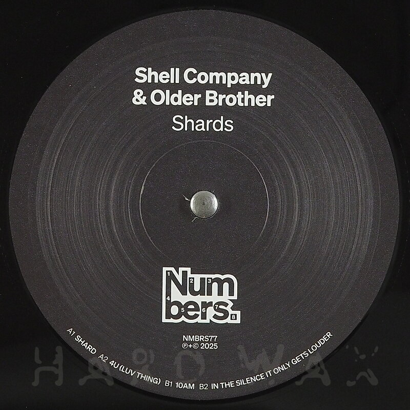 12"—12" € 17.5Numbers 077Label CatalogShell Company & Older Brother: ShardsExciting & touching experimental Electronica project A1 Shard A2 4U (Luv Thing) B1 10am B2 In The Silence It Only Gets Louder