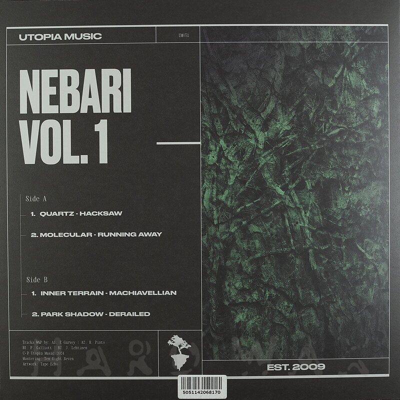 12"—12" € 15.5Utopia Music 031Label CatalogVarious Artists: Nebari Vol. 1Classy Drum & Bass rollers A1 Quartz: Hacksaw A2 Molecular: Running Away B1 Inner Terrain: Machiavellian B2 Park Shadow: Derailed