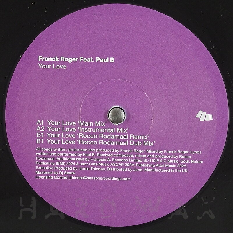 12"—12" € 17Seasons Limited 110Label CatalogFranck Roger: Your LoveLate night soulful Deep House A1 Your Love (Main Mix) A2 Your Love (Instrumental Mix) B1 Your Love (Rocco Rodamaal Remix) B2 Your Love (Rocco Rodamaal Dub Mix)