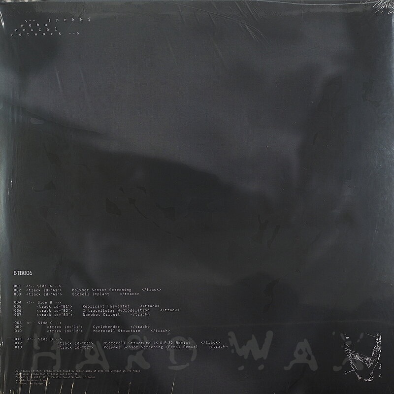Do 12"—Do 12" € 27Beyond The Bridge 006Label CatalogSpekki Webu: Neural NetworkIntense percussive textured technoid pacemaker 01 Polymer Sensor Screening 02 Biocell Implant 03 Replicant Harvester 04 Intracellular Hydrogelation 05 Nanobot Circuit 06 Cyclebender 07 Microcell Structure 08 Polymer Sensor Screening (Feral Remix) 09 Microcell Structure (K O P 32 Remix)