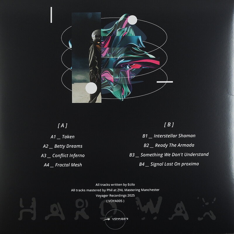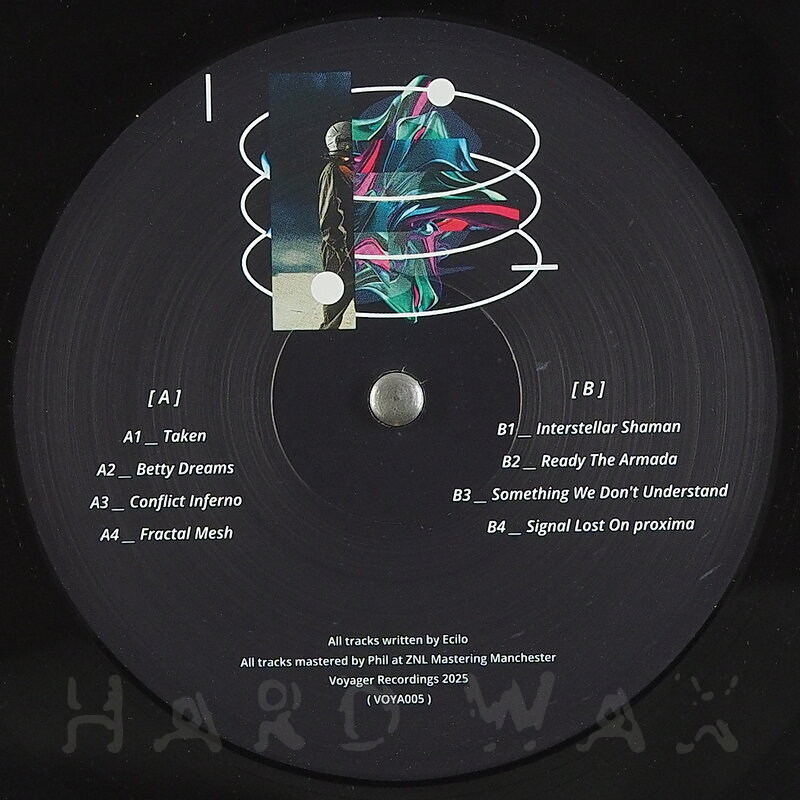LP—LP € 33Voyager 005Label CatalogEcilo: Interstellar ShamanClassy, spaced-out, early Jeff Mills inspired Techno album A1 Taken A2 Betty Dreams A3 Conflict Inferno A4 Fractal Mesh B1 Interstellar Shaman B2 Ready The Armada B3 Something We Don't Understand B4 Signal Lost On Proxima