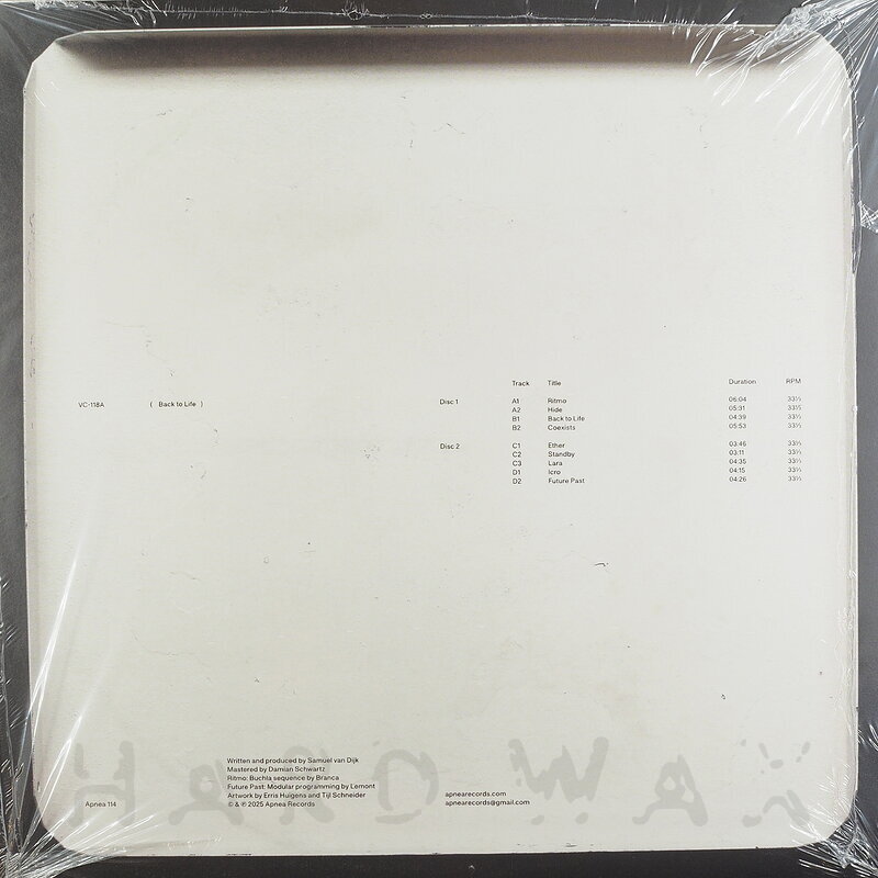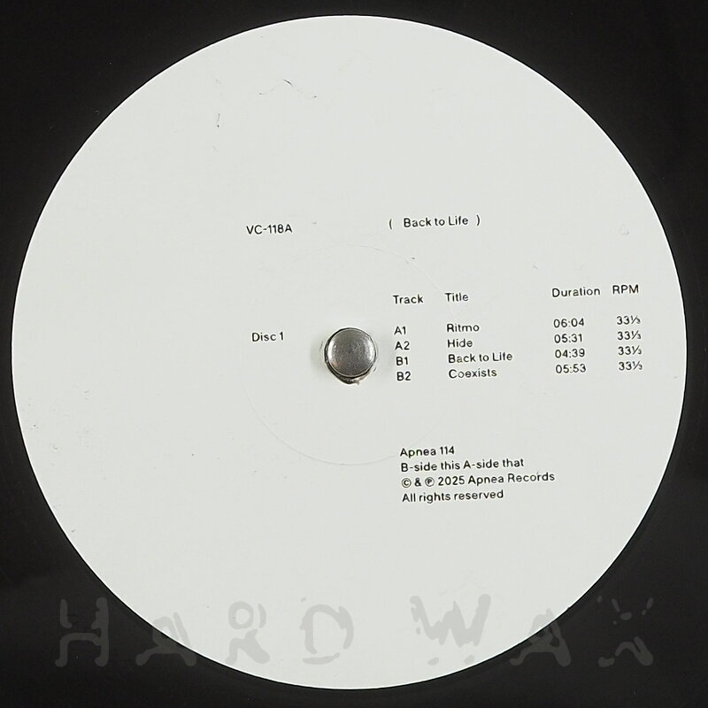 Do LP—Do LP € 33Apnea 114Label CatalogVC-118A: Back To LifeMellow atmospherics, Electro landscapes 01 Ritmo 02 Hide 03 Back To Life 04 Coexist 05 Ether 06 Standby 07 Lara 08 Icro 09 Future Past