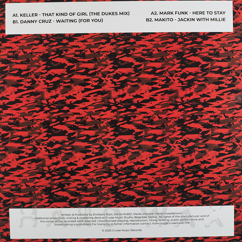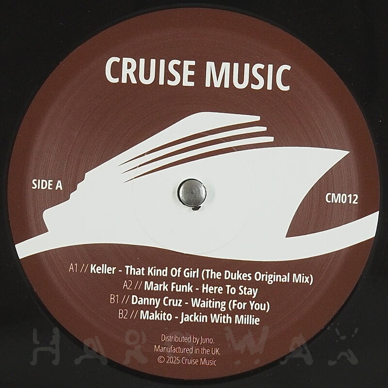 12"—12" € 19Cruise Music 012Label CatalogVarious Artists: Cruise Music Vinyl Jams Vol. XIIDisco-infused House gems A1 Keller: That Kind Of Girl (The Dukes Original Mix) A2 Mark Funk: Here To Stay B1 Danny Cruz: Waiting (For You) B2 Makito: Jackin With Millie