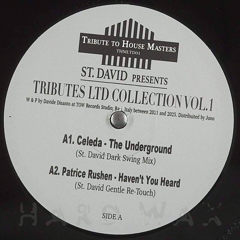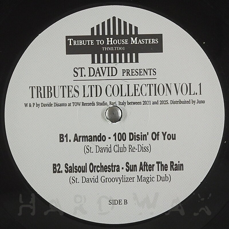 12"— out of stockTributes To House Masters 01Label CatalogSt. David: Tributes Ltd Collection Vol. 1Reworking of House / Disco classics A1 Celeda: The Underground (St David Dark Swing Mix) A2 Patrice Rushen: Haven’t You Heard (St. David Gentle Re-Touch) B1 Armando: 100% Dishin’ Of You (St David Club Re-Diss) B2 Salsoul Orchestra: Sun After The Rain (St David Groovylizer Magic Dub)