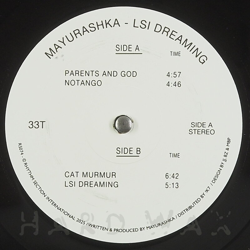 12"—12" € 18Rhythm Section International 074Label CatalogMayurashka: LSI DreamingAce, percussive, early 90s leaning House EP A1 Parents and God A2 Notango B1 Cat Murmur B2 LSI Dreaming