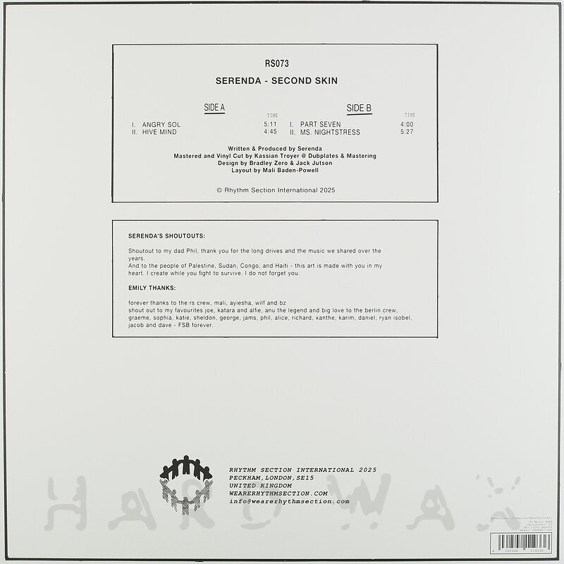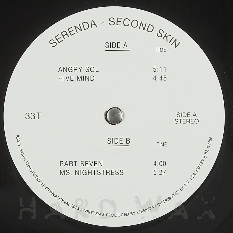 12"—12" € 18Rhythm Section International 073Label CatalogSerenda: Second SkinExcellent, diverse, atmospheric House EP A1 Angry Sol A2 Hive Mind B1 Ms. Nightstress B2 Part Seven