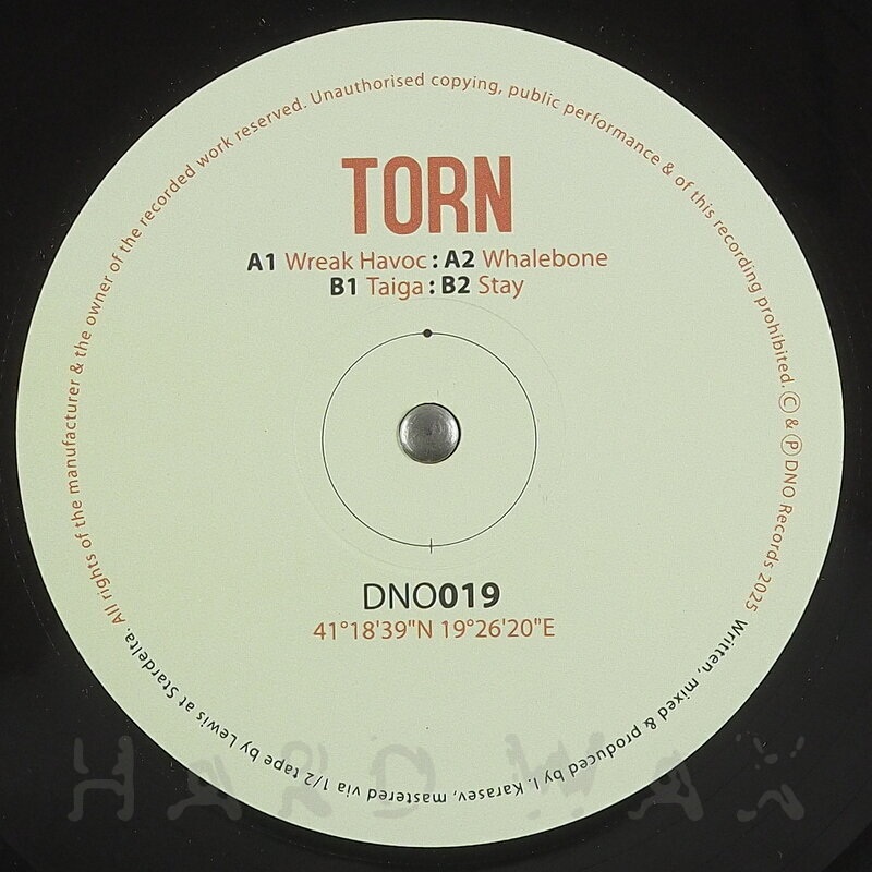 12"—12" € 17DNO 019Label CatalogTorn: Taiga EPMad, dense Industrial to hypnotic Techno / Bass hybrid EP A1 Wreak Havoc A2 Whalebone B1 Taiga B2 Stay