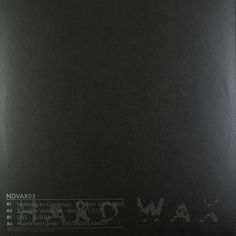 12"—12" € 19Night Defined VAX 03Label CatalogVarious Artists: NDVAX03Raw, warm & laid back House / Breakbeat EP A1 Nothing In Common: It Never Ends Well A2 Juergen Vonbank: Inside Out B1 LNS: Subba B2 Markmechanik: Deltadreamer