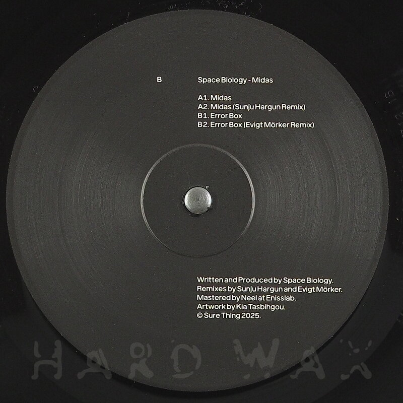 12"—12" € 18Sure Thing 009Label CatalogSpace Biology: MidasStunning, trippy, organic & trancy sonic Techno tracks A1 Midas A2 Midas (Sunju Hargun Remix) B1 Error Box B2 Error Box (Evigt Mörker Remix)