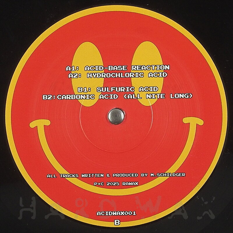 12"—12" € 14.5Acidwax 001Label CatalogMatthias Schildger presents Acidsex: Inorganic Acids EPTrippy Acid Techno workouts A1 Acid-Base Reaction A2 Hydrochloric Acid B1 Sulfuric Acid B2 Carbonic Acid (All Nite Long)