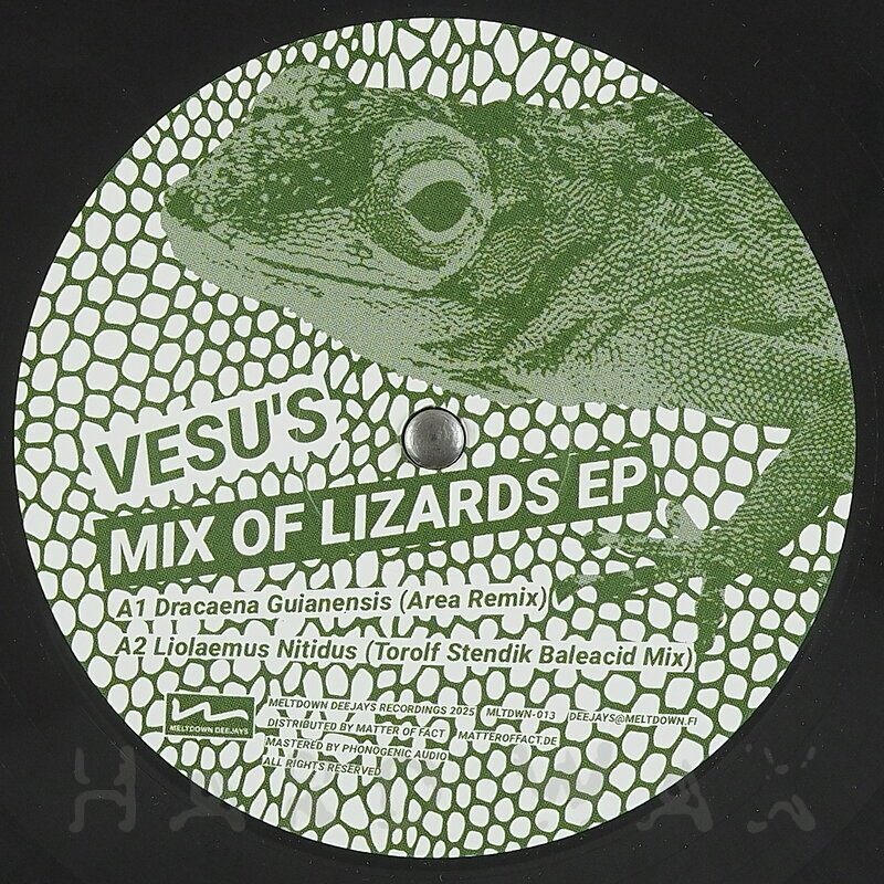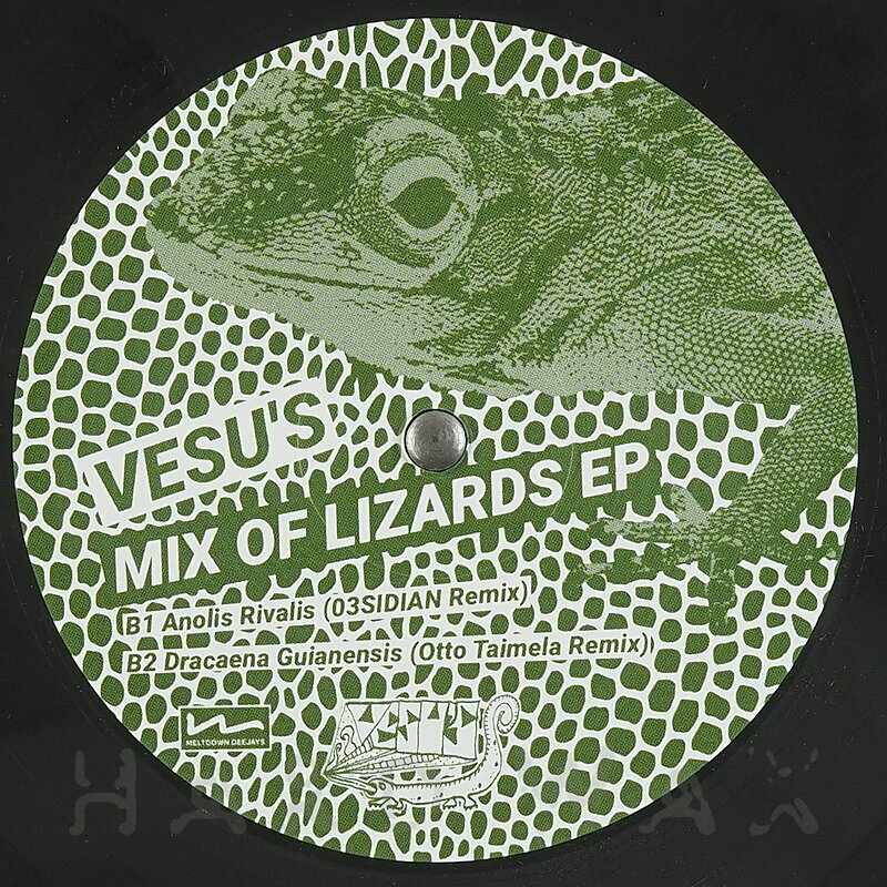 12"— out of stockMeltdown Deejays 013Label CatalogVesus: Mix Of LizardsAtmospheric late night House trips A1 Dracaena Guianensis (Area Remix) A2 Liolaemus Nitidus (Torolf Stendik Baleacid Mix) B1 Anolis Rivalis (03SIDIAN Remix) B2 Dracaena Guianensis (Otto Taimela Remix)