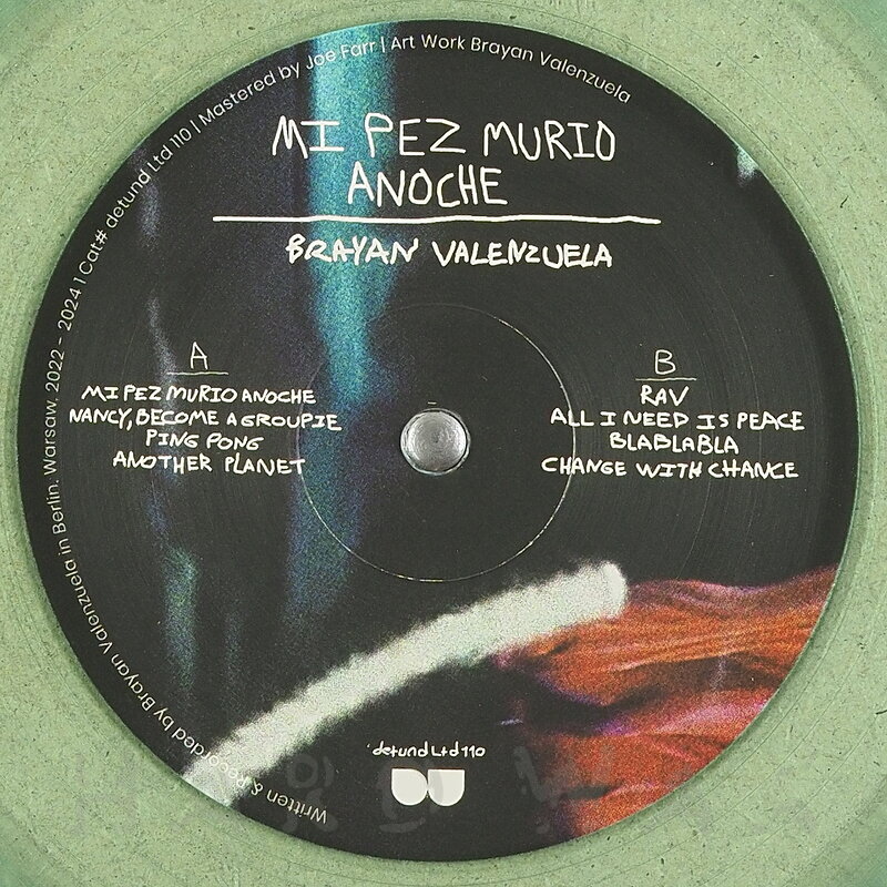 LP—LP € 36Detroit Underground Ltd 110Label CatalogBrayan Valenzuela: Mi Pez Murió AnochePowerful raving Breakbeat / Electro-Techno bangers A1 Mi Pez Murió Anoche A2 Nancy, She Become a Groupie A3 Ping Pong A4 Another Planet B1 Rav B2 All I Need Is Peace B3 BlaBlaBla B4 Change with Chance
