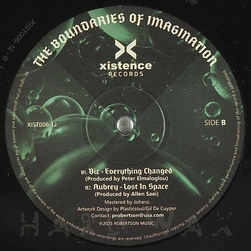 12"—12" € 17.5Xistence 006Label CatalogVarious Artists: The Boundaries of ImaginationBeautiful, 90s Detroit oriented Techno / House mini-compilation w/ killer Aubrey cut A1 Arbilla: Wave Function A2 DJ Compufunk: Shadow of Dance B1 Biz: Everything Changed B2 Aubrey: Lost In Space
