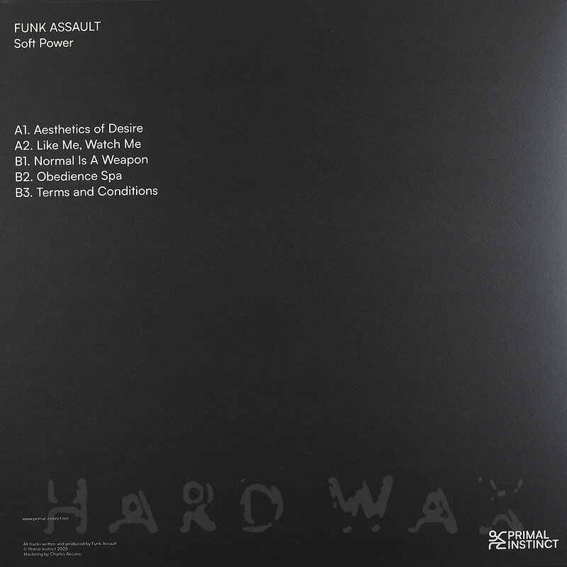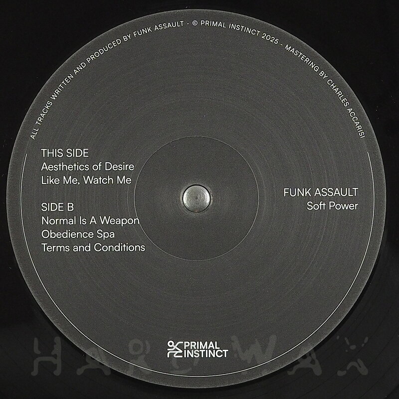 12"—12" € 15.5Primal Instinct 009Label CatalogFunk Assault: Soft PowerBig room Techno impacts A1 Aesthetics of Desire A2 Like Me, Watch Me B1 Normal Is Weapon B2 Obedience Spa B3 Terms and Conditions