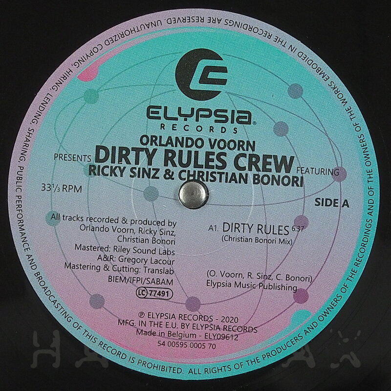 12"—12" € 13.5Elypsia 09612Label CatalogOrlando Voorn presents Dirty Rules Crew: Dirty RulesPure Detroit influenced House 01 Dirty Rules (Christian Bonori Mix) 02 Dirty Rules (Orlando Voorn Remix) 03 Dirty Rules (Deeptech Mix)
