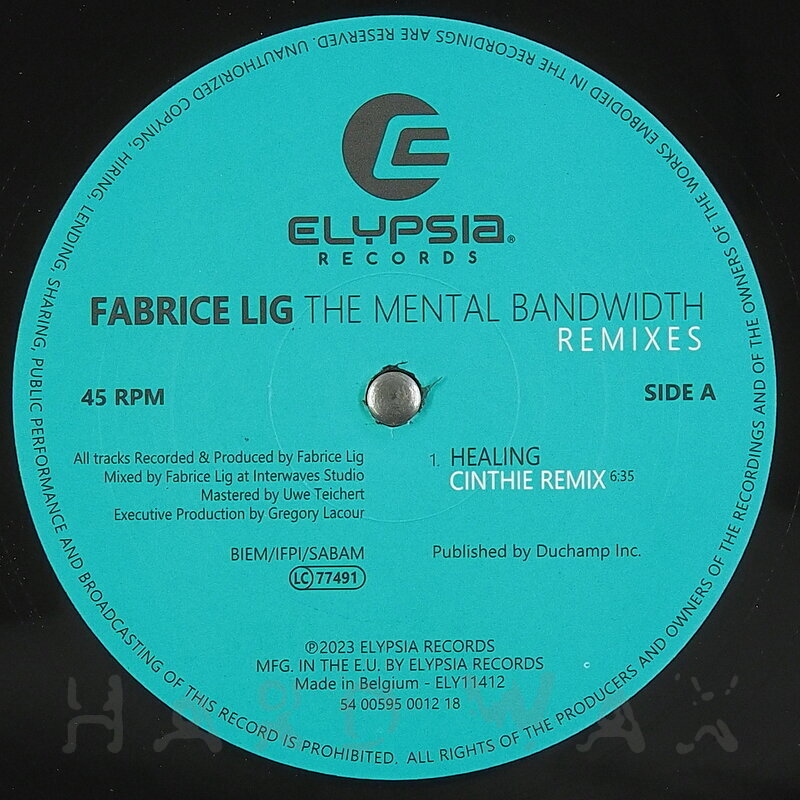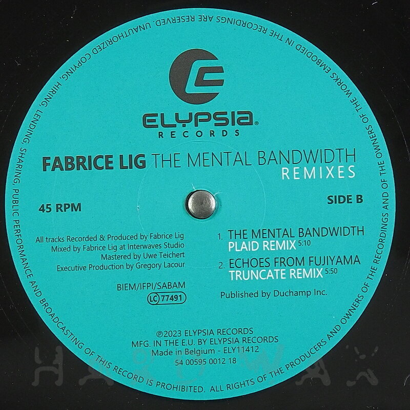 12"—12" € 17Elypsia 114Label CatalogFabrice Lig: The Mental Bandwidth RemixesRemixes of soulful Detroit inspired House 01 Healing (Cinthie Remix) 02 The Mental Bandwidth (Plaid Remix) 03 Echoes from Fujiyama (Truncate Remix)