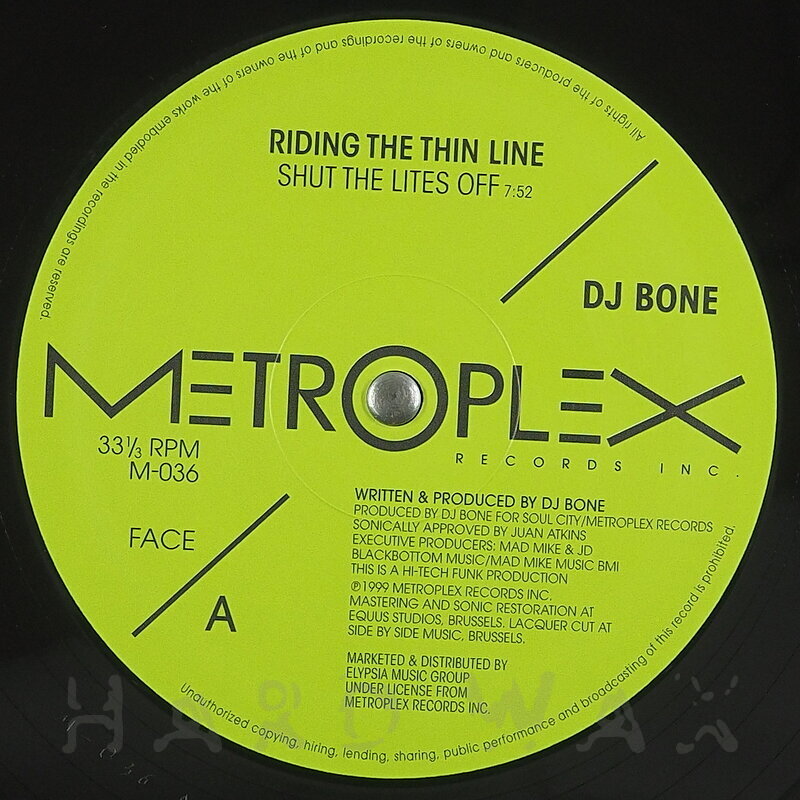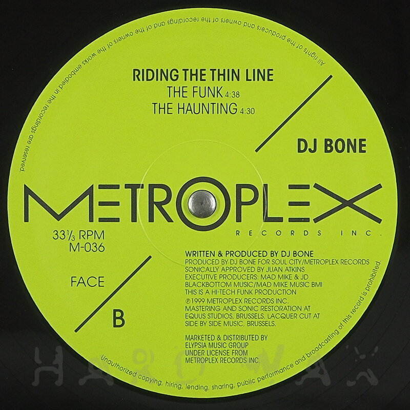 12"—12" € 17.5Metroplex 036Label CatalogDJ Bone: Riding The Thin LineOriginally released in 1999! Pumping, percussive Techno/Electro Bass tracks A1 Shut The Lites Off B1 The Funk B2 The Haunting