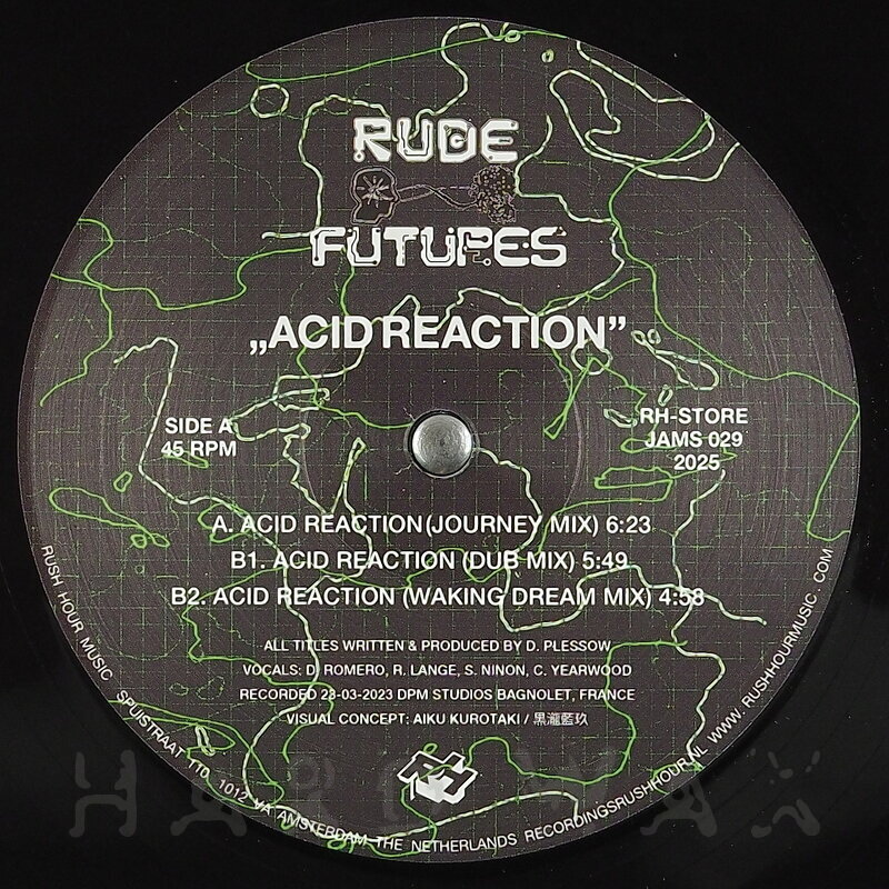 12"— out of stockRush Hour JAMS 029Label CatalogRude Futures: Acid ReactionConvincingly late 80s Chicago leaning, MCDE prod. Acid House goodness A1 Acid Reaction (The Journey Mix) B1 Acid Reaction (The Dub) B2 Acid Reaction (Waking Dream)