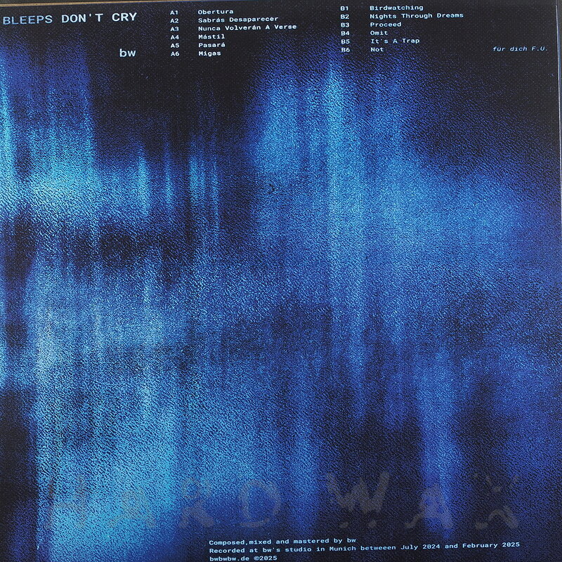 LP— out of stockBlack Wood 009Label Catalogbw: Bleeps Don't CryImmersive journey through bleepy, hypnotic atmospheres A1 Obertura A2 Sabras Desaparecer A3 Nunca Volveran A Verse A4 Mastil A5 Pasara A6 Migas B1 Birdwatching B2 Nights Through Dreams B3 Proceed B4 Omit B5 It's A Trap B6 Not