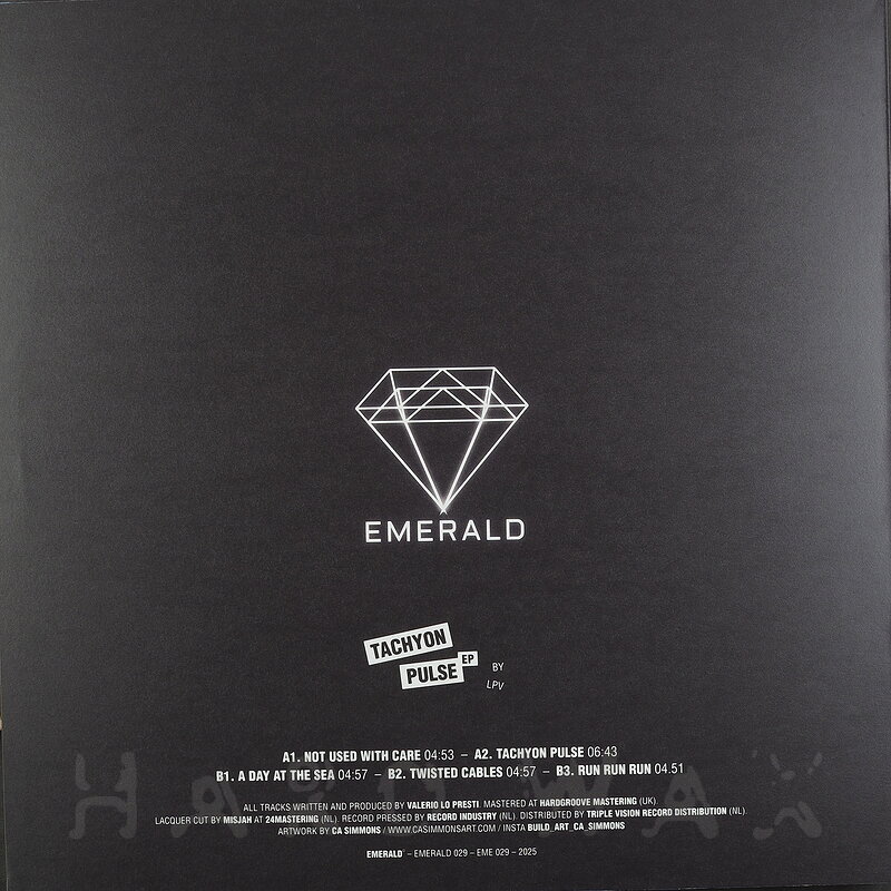 12"—12" € 16Emerald 029Label CatalogLPV: Tachyon Pulse EPRelentless driving, atmospheric Techno 01 Not Used With Care 02 Tachyon Pulse 03 A Day At The Sea 04 Twisted Cables 05 Run Run Run