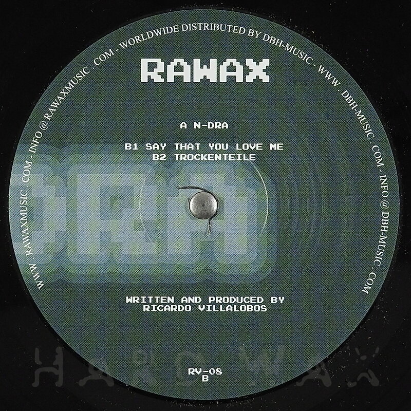12"—12" € 16Rawax RV 08Label CatalogRicardo Villalobos: N-DRAReissue of splendid mid-1990s minimalist Tech House groovers A1 N-DRA B1 Say That You Love Me B2 Trockenteile
