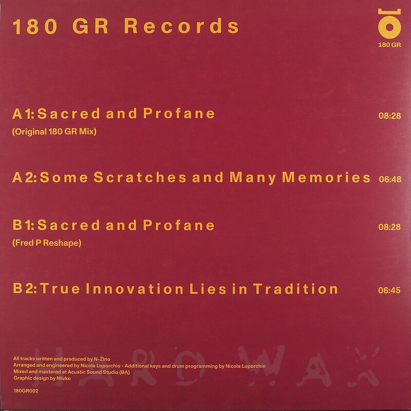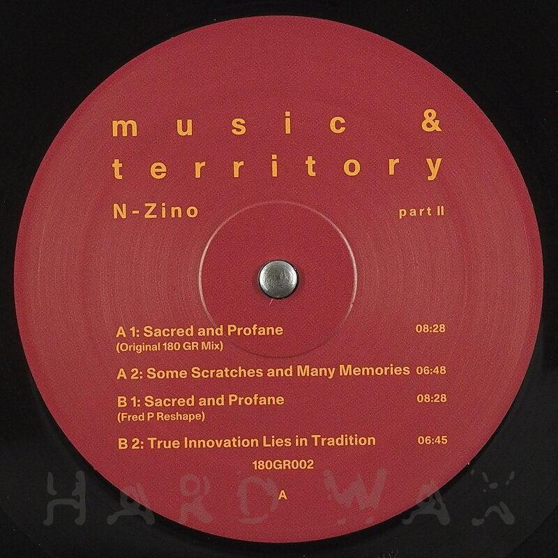 12"—12" € 18180 GR Records 002Label CatalogN-Zino: Music & Territory (Part II)Excellent Deep House grooves w/ Fred P Remix A1 Sacred and Profane (Original 180 GR Mix) A2 Some Scratches and Many Memories B1 Sacred and Profane (Fred P Reshape) B2 True Innovation Lies in Tradition