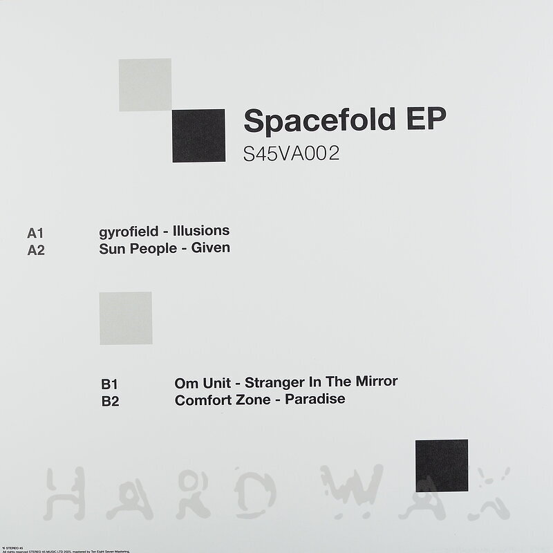 12"—12" € 19Stereo 45 VA 002Label CatalogVarious Artists: Spacefold EPMad, metallic driven sci-fi to atmospheric, playful Bass / Halftime / Drum & Bass compilation A1 Gyrofield: Illusions A2 Sun People: Given B1 Om Unit: Stranger In The Mirror B2 Comfort Zone: Paradise