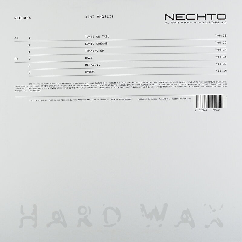 12"—12" € 18.5Nechto 034Label CatalogDimi Angélis: Nech034Playful, daring, deep but forward Techno EP A1 Tones On Tail A2 Sonic Dreams A3 Transmuted B1 Haze B2 Metavoid B3 Hydra