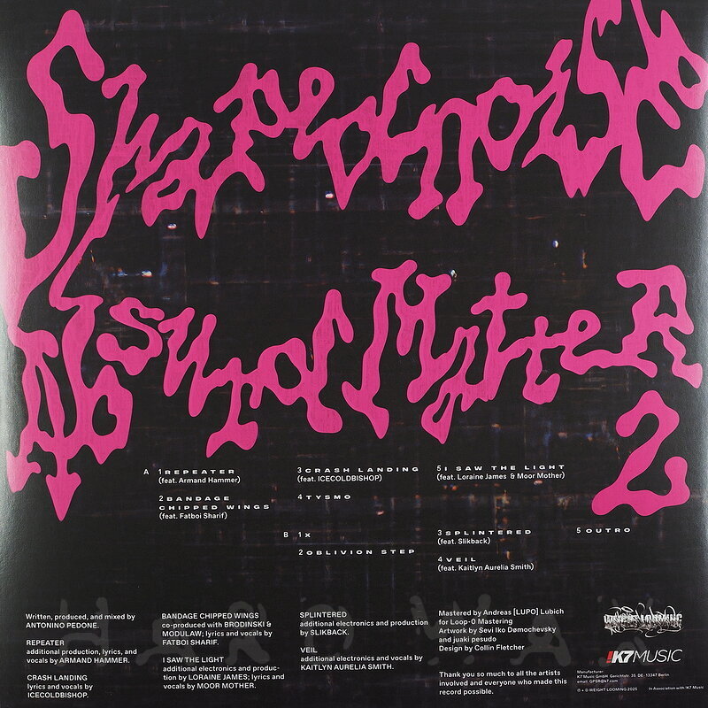 LP—LP € 33Weight Looming 002 LPLabel CatalogShapednoise: Absurd Matter 2Dissociating, metallic sci-fi, expressive & poetic Experimental / Bass / Rap hybrid LP A1 Repeater (Feat. Armand Hammer) A2 Bandage Chipped Wings (Feat. Fatboi Sharif) A3 Crash Landing (Feat. ICECOLDBISHOP) A4 Tysmo A5 I Saw The Light (Feat. Loraine James & Moor Mother) B1 X B2 Oblivion Step B3 Splintered (Feat. Slikback) B4 Veil (Feat. Kaitlyn Aurelia Smith) B5 Outro