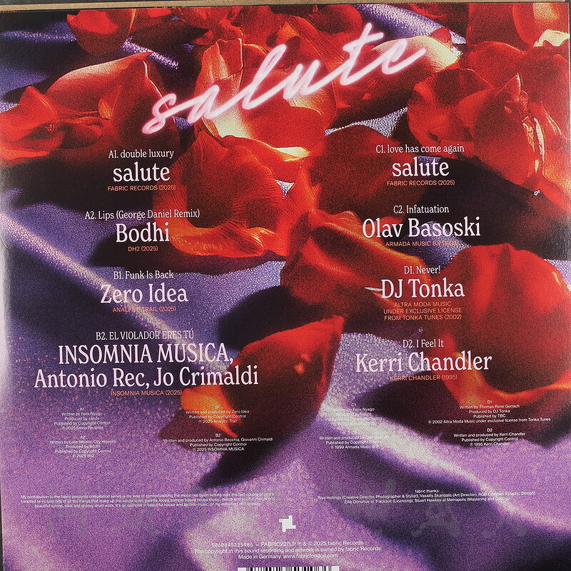 Do 12"—Do 12" € 26Fabric 227LPLabel CatalogSalute: Fabric PresentsFloor-friendly energetic deep house compilation A1 Double Luxury A2 Bodhi: Lips (George Daniel Remix) B1 Zero Idea: Funk Is Back B2 Insomnia Musica, Antonio Rec, Jo Crimaldi: El Violador Eres Tú C1 Love Has Come Again C2 Olav Basoski: Infatuation D1 DJ Tonka: Never! D2 Kerri Chandler: I Feel It