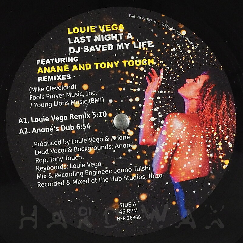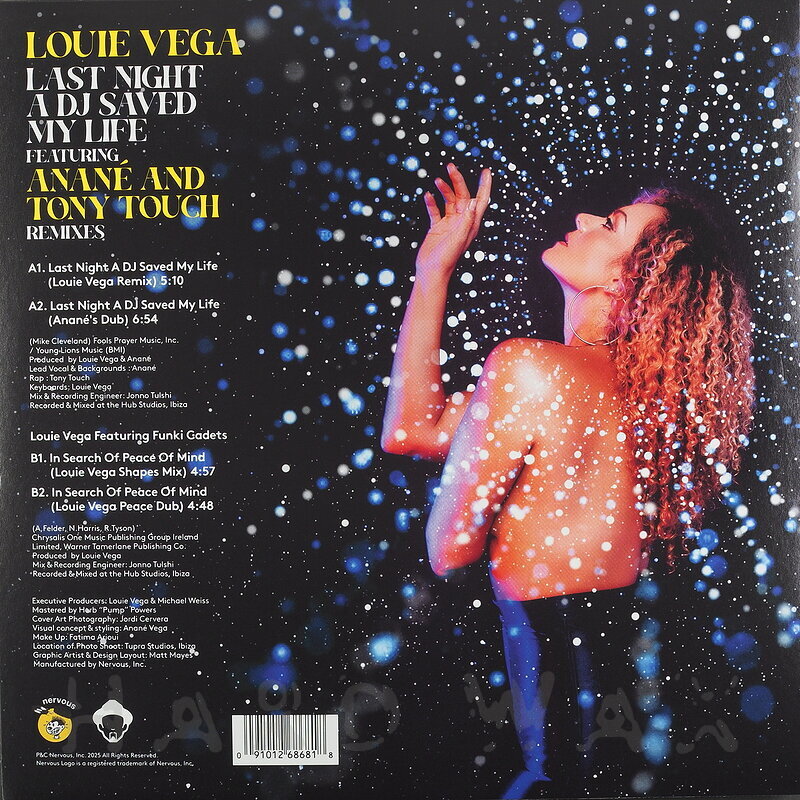 12"—12" € 18Nervous 26868Label CatalogLouie Vega: Last Night a DJ Saved My LifeHouse reworking of a Disco classic A1 Last Night a DJ Saved My Life (Louie Vega Remix) A2 Last Night a DJ Saved My Life (Anané’s Dub) B1 In Search of Peace of Mind (Louie Vega Shapes Mix) B2 In Search of Peace of Mind (Louie Vega Peace Dub)