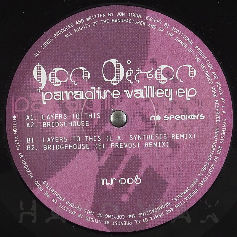 12"—12" € 18No Speakers 006Label CatalogJon Dixon: Paradise Valley EPLush jazz infused Detroit deep house A1 Layers To This A2 Bridgehouse B1 Layers To This (LA Synthesis Remix) B2 Bridgehouse (El Prevost Remix)