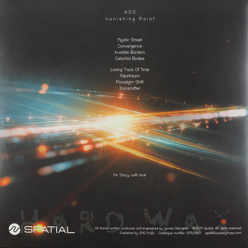Do LP—Do LP € 32Auxiliary Spatial LP 007Label CatalogASC: Vanishing PointStunningly perfect Drum & Bass floaters 01 Mystic Street 02 Convergence 03 Invisible Borders 04 Celestial Bodies 05 Losing Track Of Time 06 Slipstream 07 Paradigm Shift 08 Transmitter