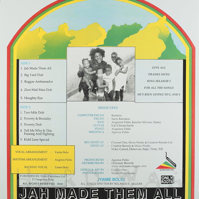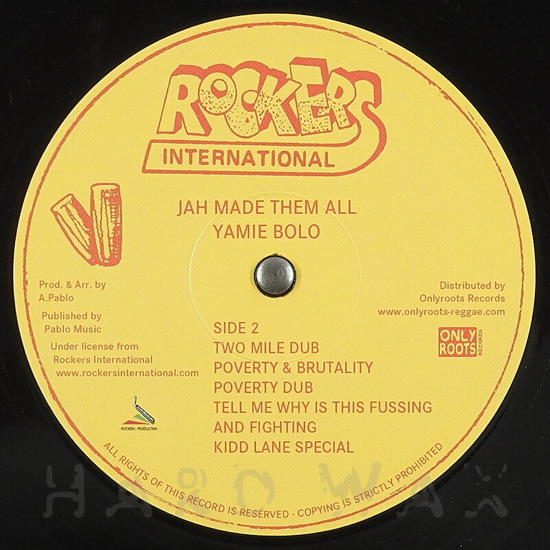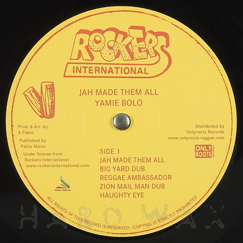 LP—LP € 26Onlyroots ORLP 31Reggae / A45Yami Bolo: Jah Made Them AllReissue of classic, superb, late 80s digi showcase produced by Augustus Pablo & Rockers All Stars A1 Jah Made Them All A2 Big Yard Dub A3 Reggae Ambassador A4 Zion Mail Man Dub A5 Haughty Eye B1 Two Mile Dub B2 Poverty & Brutality B3 Poverty Dub B4 Tell Me Why Is This Fussing And Fighting B5 Kidd Lane Special