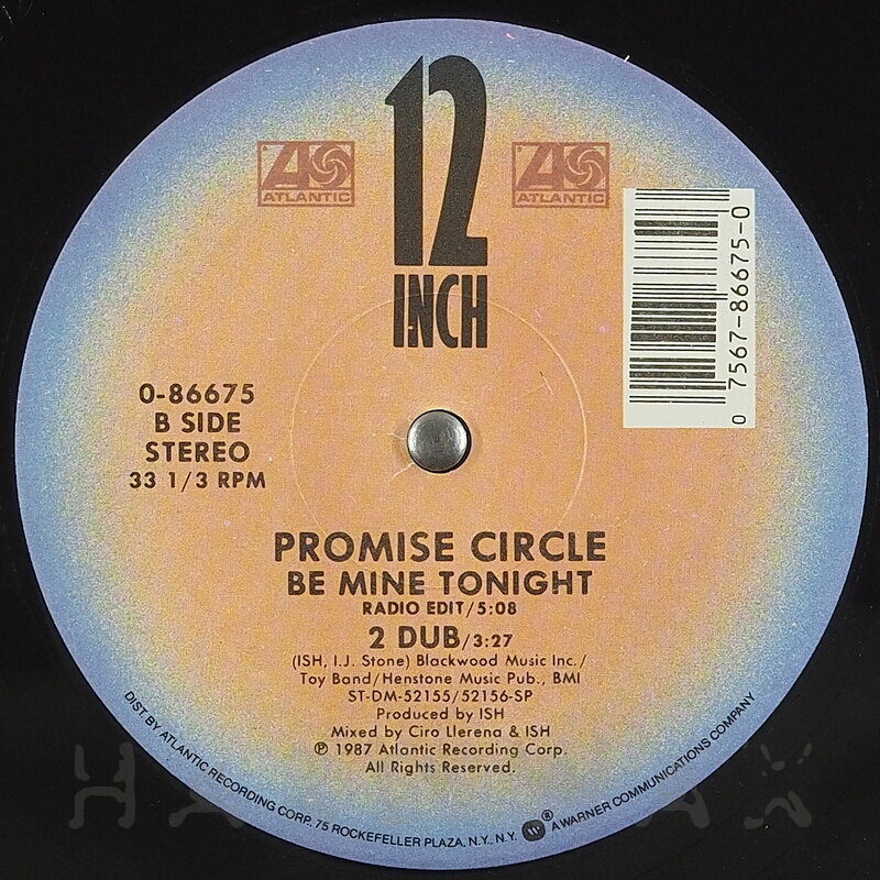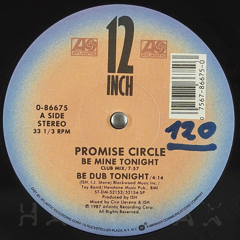 12"—12" € 20Atlantic 0-86675Label CatalogPromise Circle: Be Mine TonightWarehouse find, vg+, wol A1 Be Mine Tonight (Club Mix) A2 Be Dub Tonight B1 Be Mine Tonight (Radio Edit) B2 2 Dub