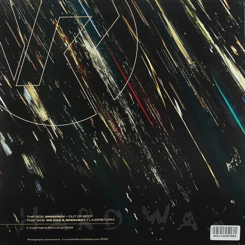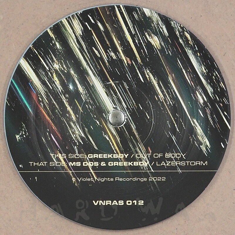 12"—12" € 16Violet Nights 012Label CatalogGreekboy: Out Of BodyClassy, deep Drum & Bass rollers A1 Out Of Body B1 MsDos & Greekboy: Lazerstorm