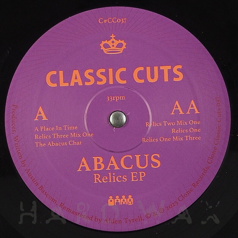 12"—12" € 18Clone CC 37Label CatalogAbacus: The Relics EPReissue of early 90s Deep House classics A1 A Place In Time A2 Relics Three - Mix One A3 The Abacus Chat B1 Relics Two - Mix One B2 Relics One B3 Relics One - Mix Three