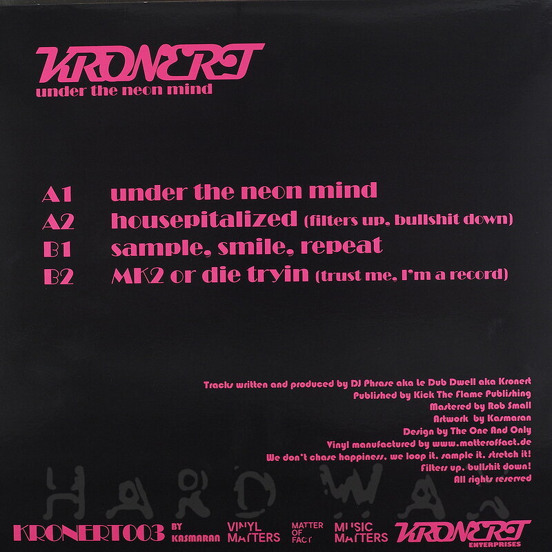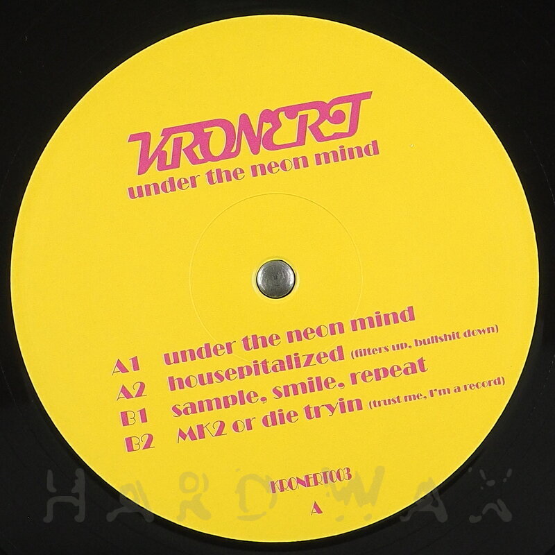 12"—12" € 16Kronert Enterprises 003Label CatalogKronert: Under The Neon MindDeep, pumping Dub Techno / House tunes A1 Under The Neon Mind A2 Housepitalized B1 Sample, Smile, Repeat B2 Mk2 Or Die Tryin