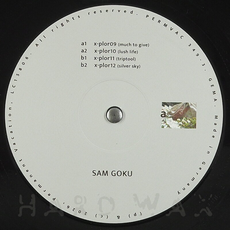 12"—12" € 18.5Permanent Vacation 349 - 3Label CatalogSam Goku: Explorations 03Warm, floating, fine, left-field House tunes A1 x-plor09 (much to give) A2 x-plor10 (lush life) B1 x-plor11 (triptool) B2 x-plor12 (silver sky)