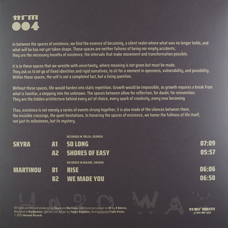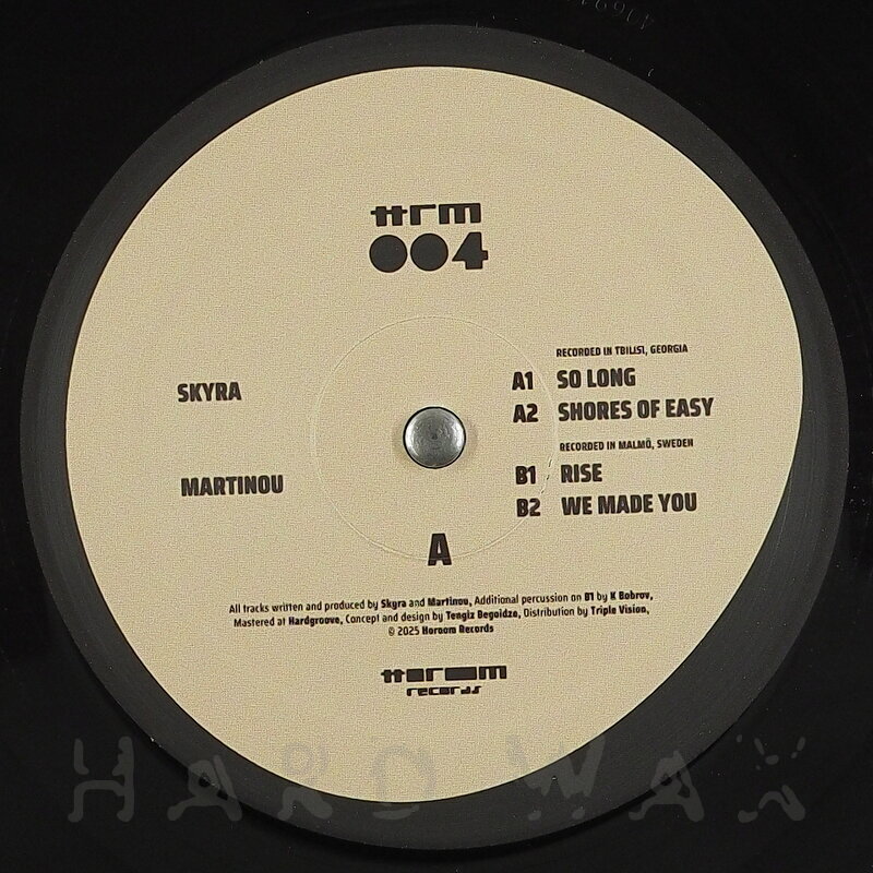12"—12" € 16Horoom 004Label CatalogSkyra / Martinou: HRM004Stripped back, percussive, atmospheric Techno A1 Skyra: So Long A2 Skyra: Shores Of Easy B1 Martinou: Rise B2 Martinou: We Made You