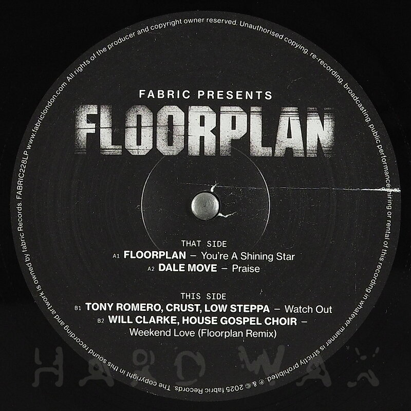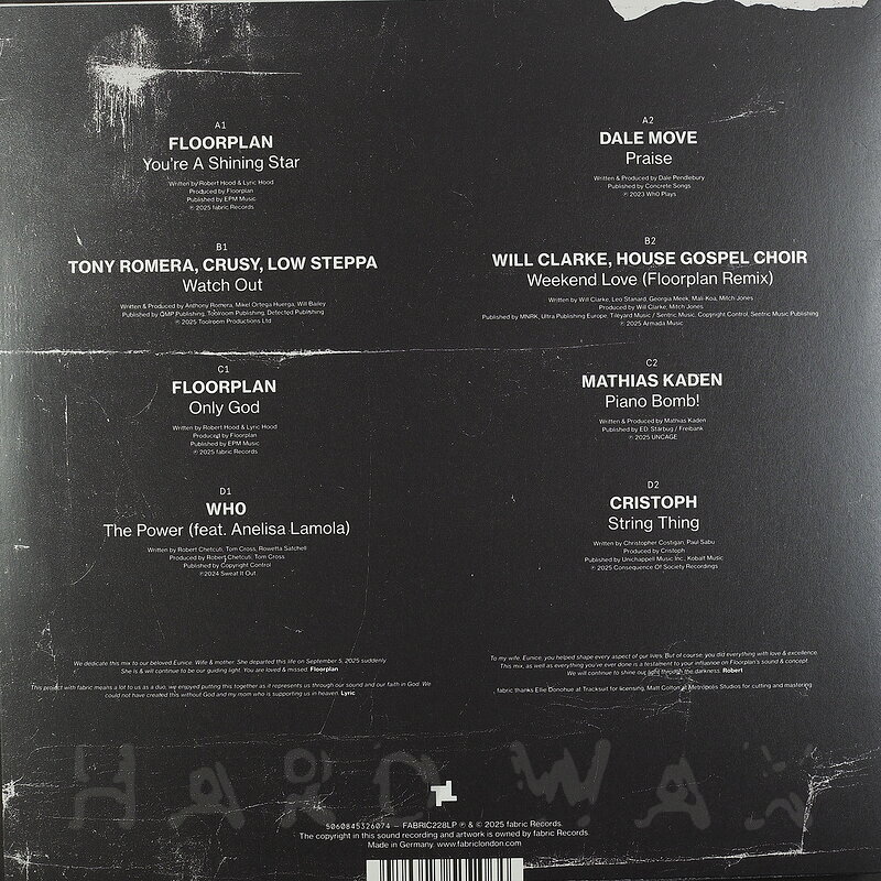 Do 12"—Do 12" € 26Fabric 228LPLabel CatalogVarious Artists: FloorplanRobert Hood & Lyric Hood prod. Detroit sounds A1 Floorplan: You’re A Shining Star A2 Dale Move: Praise B1 Tony Romera, Crusy, Low Steppa: Watch Out B2 Will Clarke: Weekend Love (Floorplan Remix) C1 Floorplan: Only God C2 Mathias Kaden: Piano Bomb! D1 Wh0: The Power D2 Cristoph: String Thing