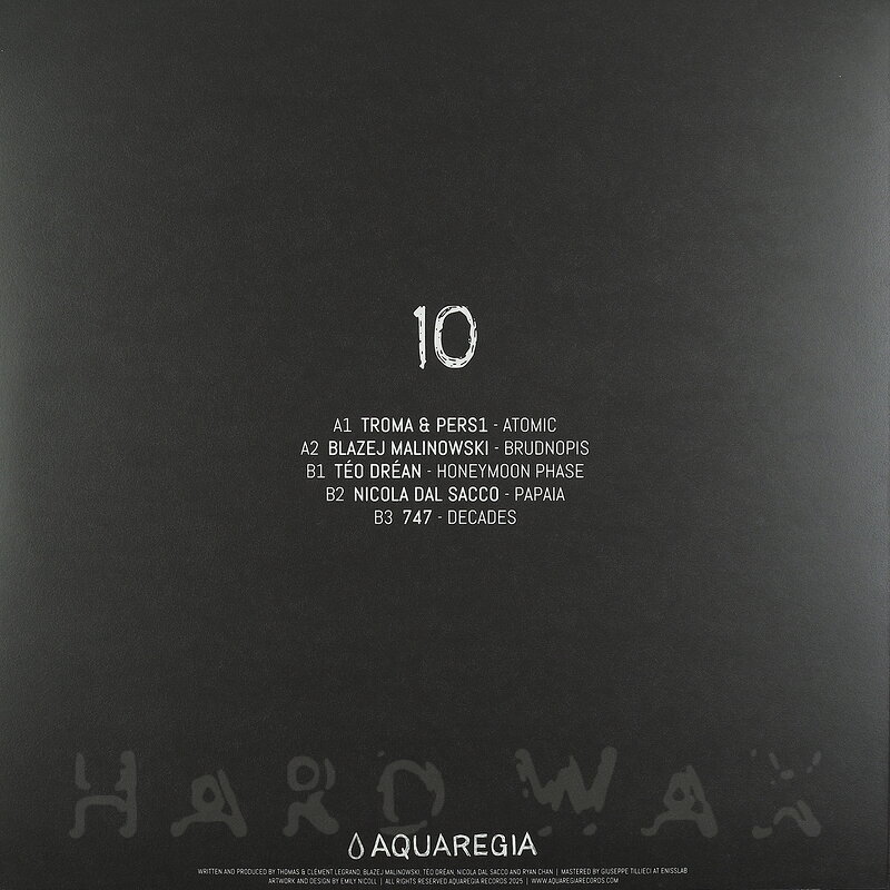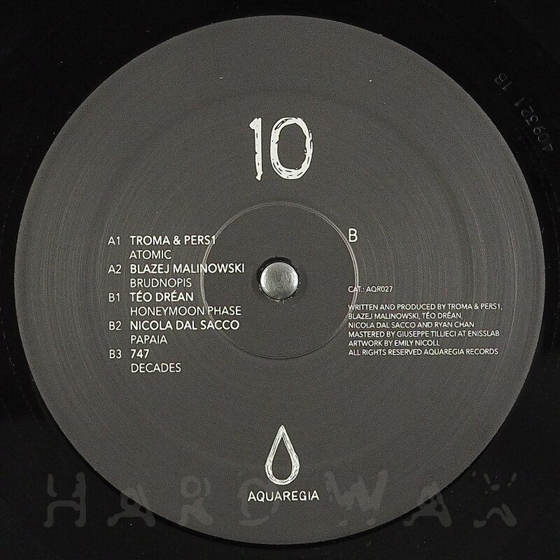 12"—12" € 16Aquaregia 027Label CatalogVarious Artists: 10Versatile trancy Techno mini-compilation A1 Troma & PERS1: Atomic A2 Blazej Malinowski: Brudnopis B1 Téo Dréan: Honeymoon Phase B2 Nicola Dal Sacco: Papaia B3 747: Decades