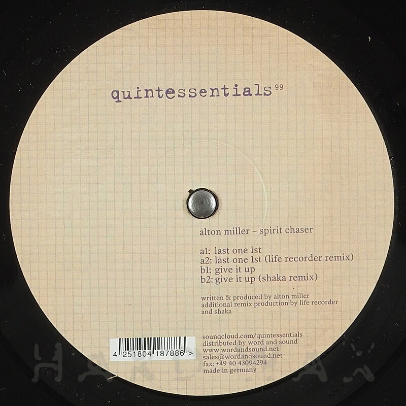 12"—12" € 17Quintessentials 099Label CatalogAlton Miller: Spirit ChaserFine, smooth, soulful Deep House EP 01 Last One 1st 02 Last One 1st (Life Recorder Remix) 03 Give It Up 04 Give It Up (Shaka Remix)